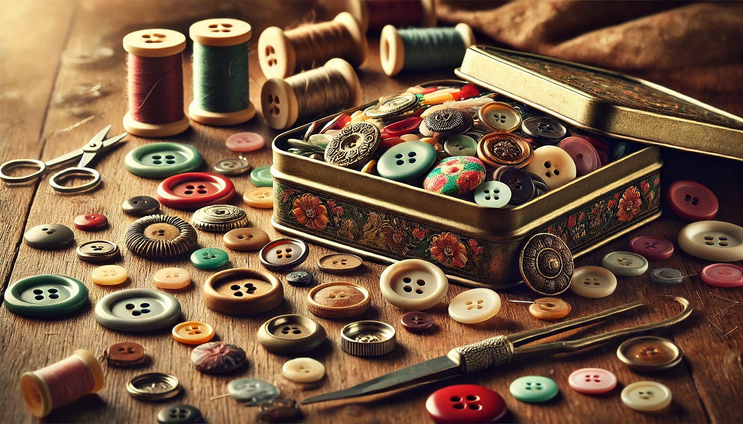 Watching my mother with her button taught me something else too. She never seemed frustrated by buttons that didn’t match immediately. She took pleasure in the collecting itself, in running her fingers through her tin of possibilities.